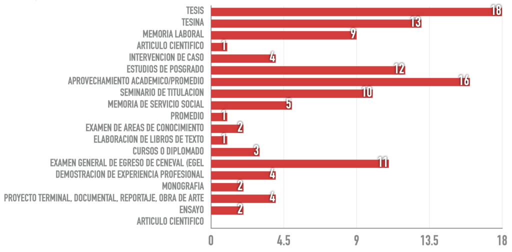 - Tesis, Tesina, Ensayo, Memoria laboral, Aprovechamiento académico, Artículo científico, Seminario de titulación, Estudios de posgrado, Elaboración de documental, Elaboración de reportaje a profundidad, Examen General de Egreso del CENEVAL (EGEL), Demostración de experiencia profesional, Servicio Social, Ampliación y profundización de conocimientos por semestre adicional o en diplomados